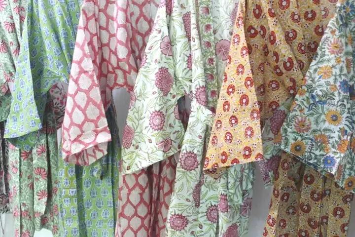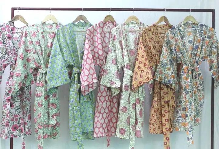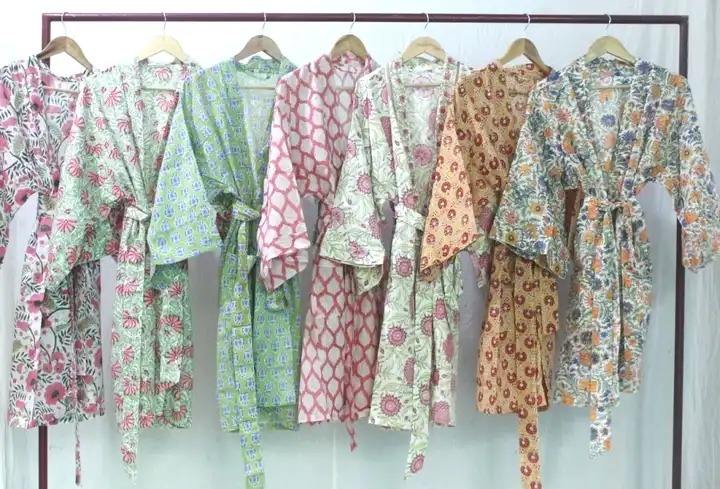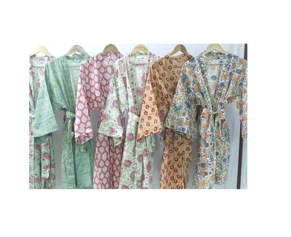 ชุดกิโมโนผ้าฝ้ายพิมพ์ลายบล็อกมาใหม่ชุดคลุมอาบน้ำสไตล์วินเทจสำหรับผู้หญิง