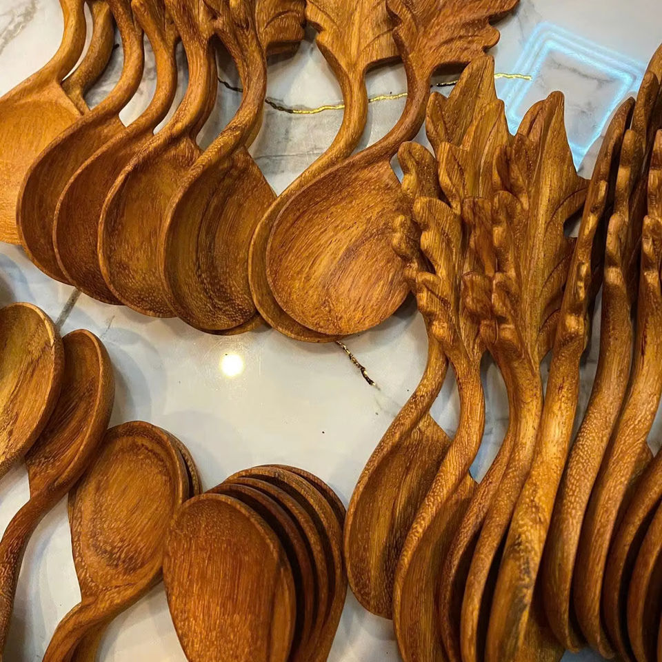 ชุดของขวัญภาชนะไม้แกะสลักธรรมชาติหลากหลายชนิด ปราศจากขยะ ประกอบด้วยช้อนกาแฟ ช้อนชา และตะหลิว สำหรับเสิร์ฟอาหารในงานเลี้ยงที่บ้าน