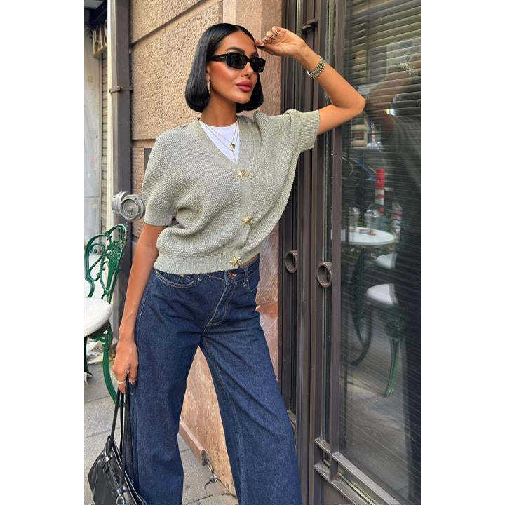 เสื้อคาร์ดิแกนถักกระดุมทองสไตล์ลำลองแอสเทอเรีย 5182