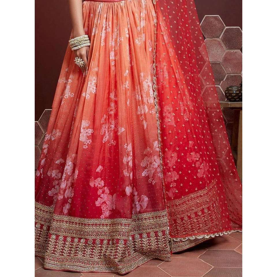 ชุดเลเฮนกาโชลีผ้าไหมออร์แกนซ่าพิมพ์ลายดิจิทัลสีส้มสุดตระการตา แบบกึ่งสำเร็จรูป จาก Zeel Clothing