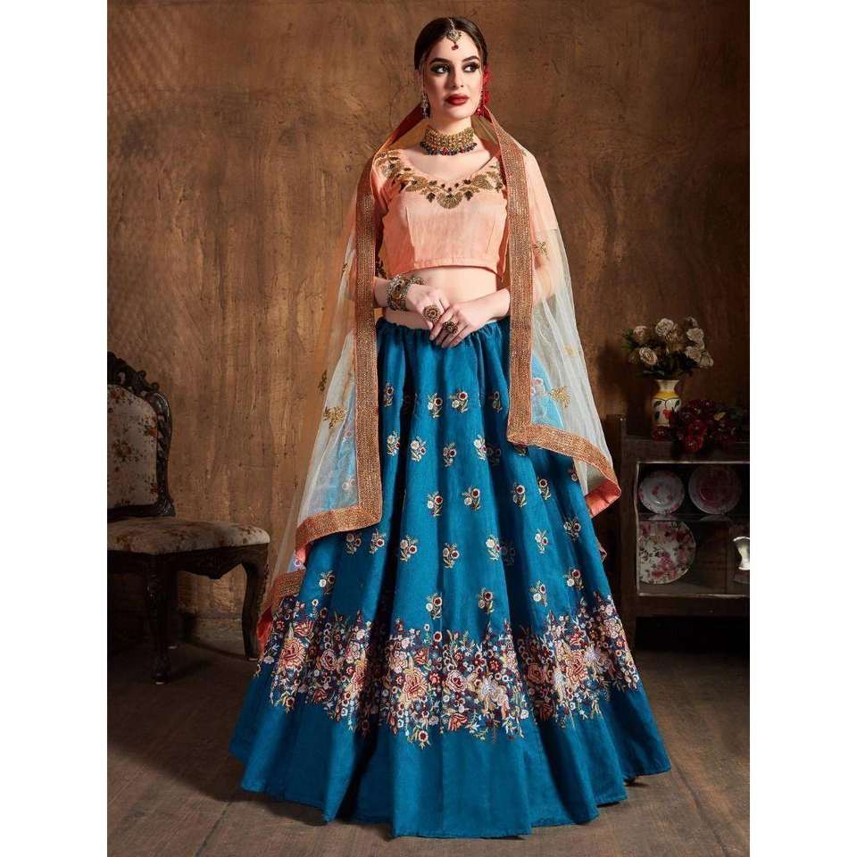 ชุดเลเฮนกาโชลีงานปักดิ้นสีฟ้าอมเขียวสุดตระการตา ผ้าไหมดิบแบบเย็บกึ่งสำเร็จ สำหรับงานแต่งงาน โดย Zeel Clothing