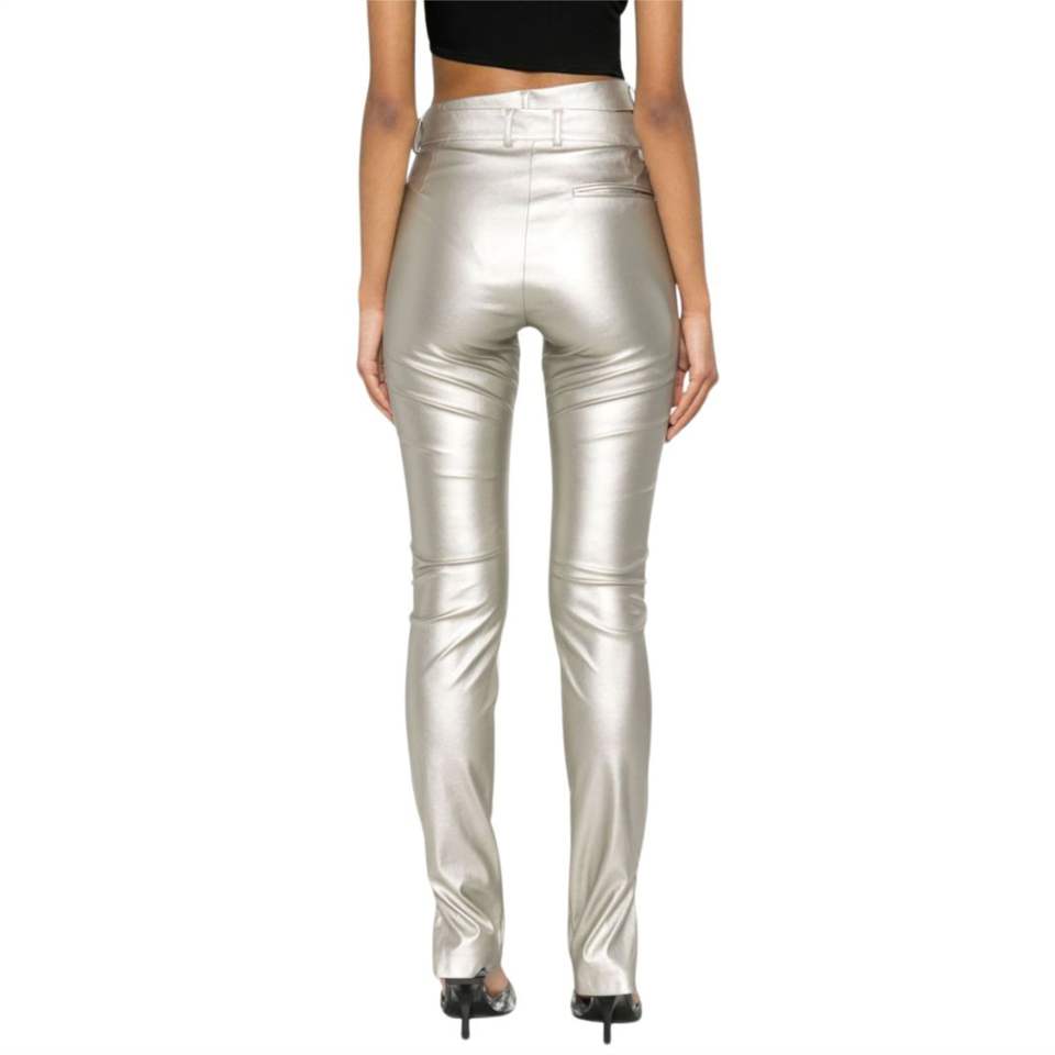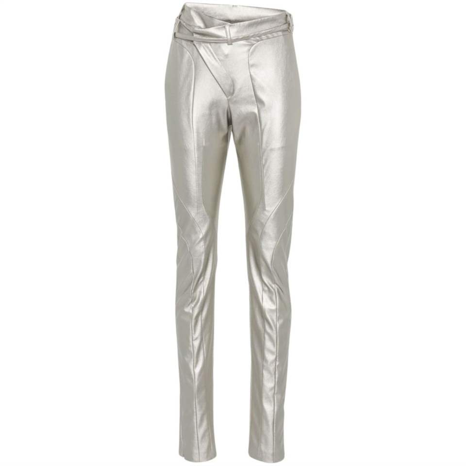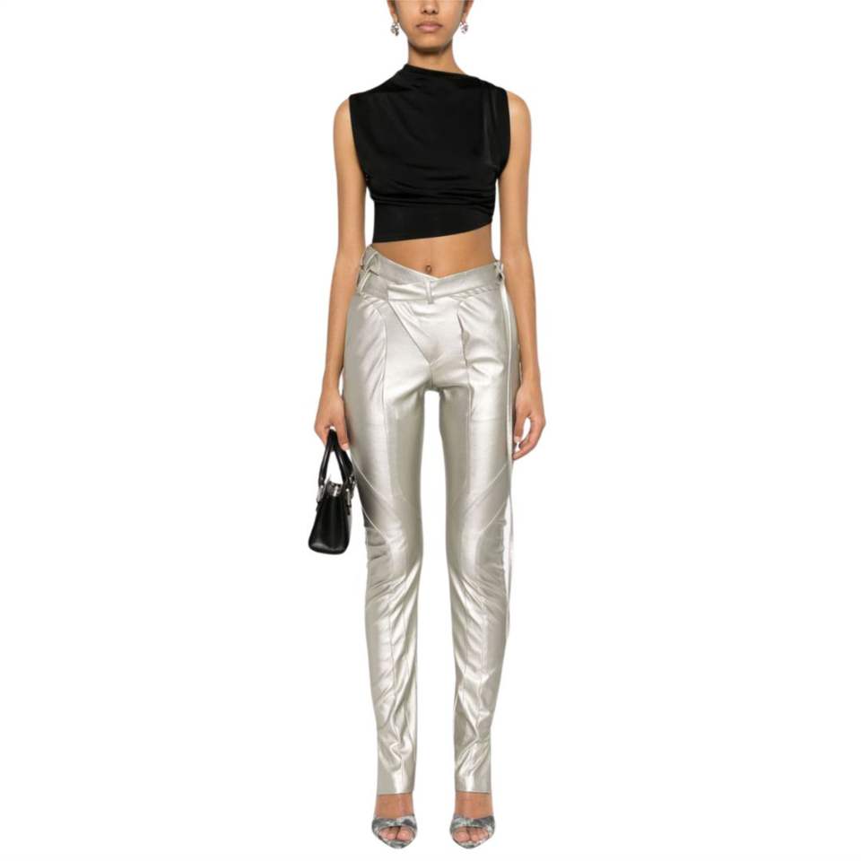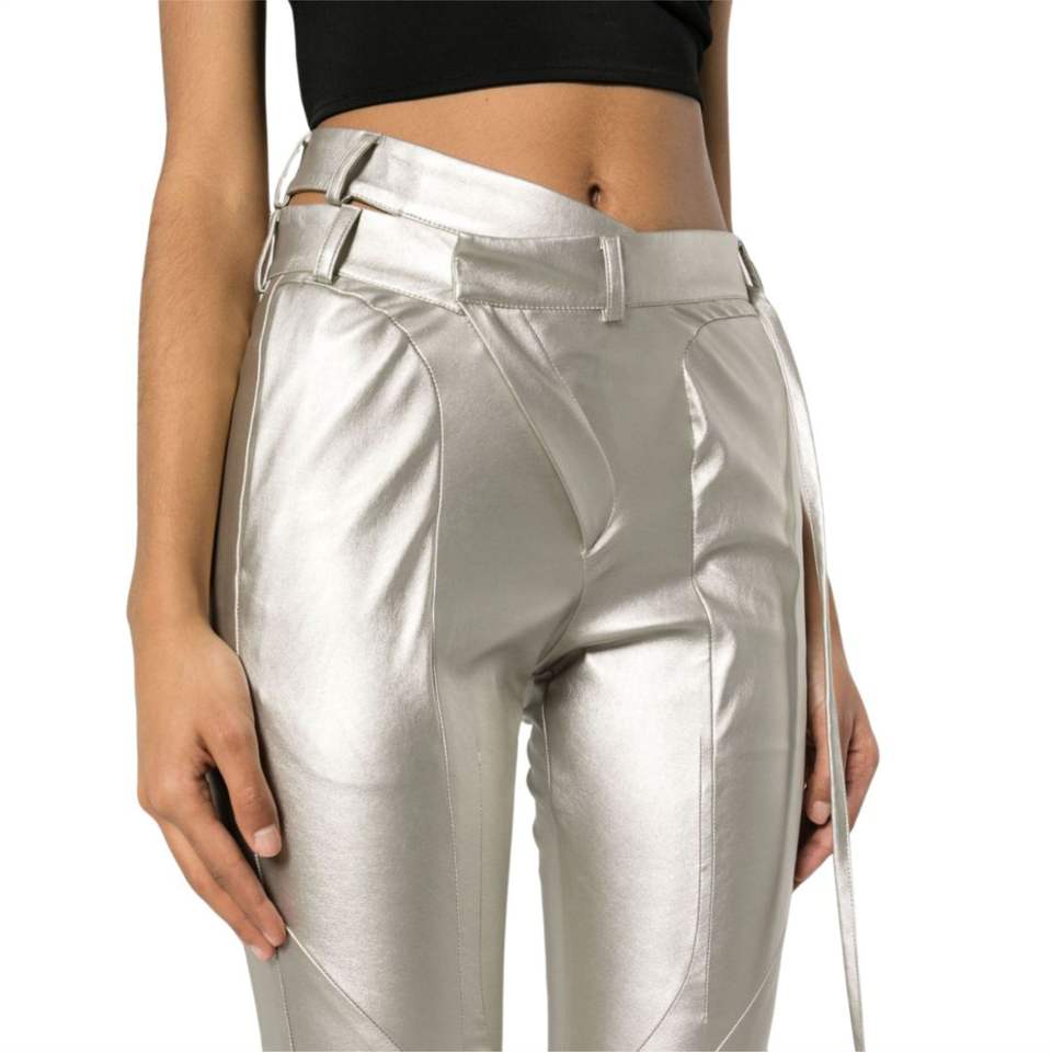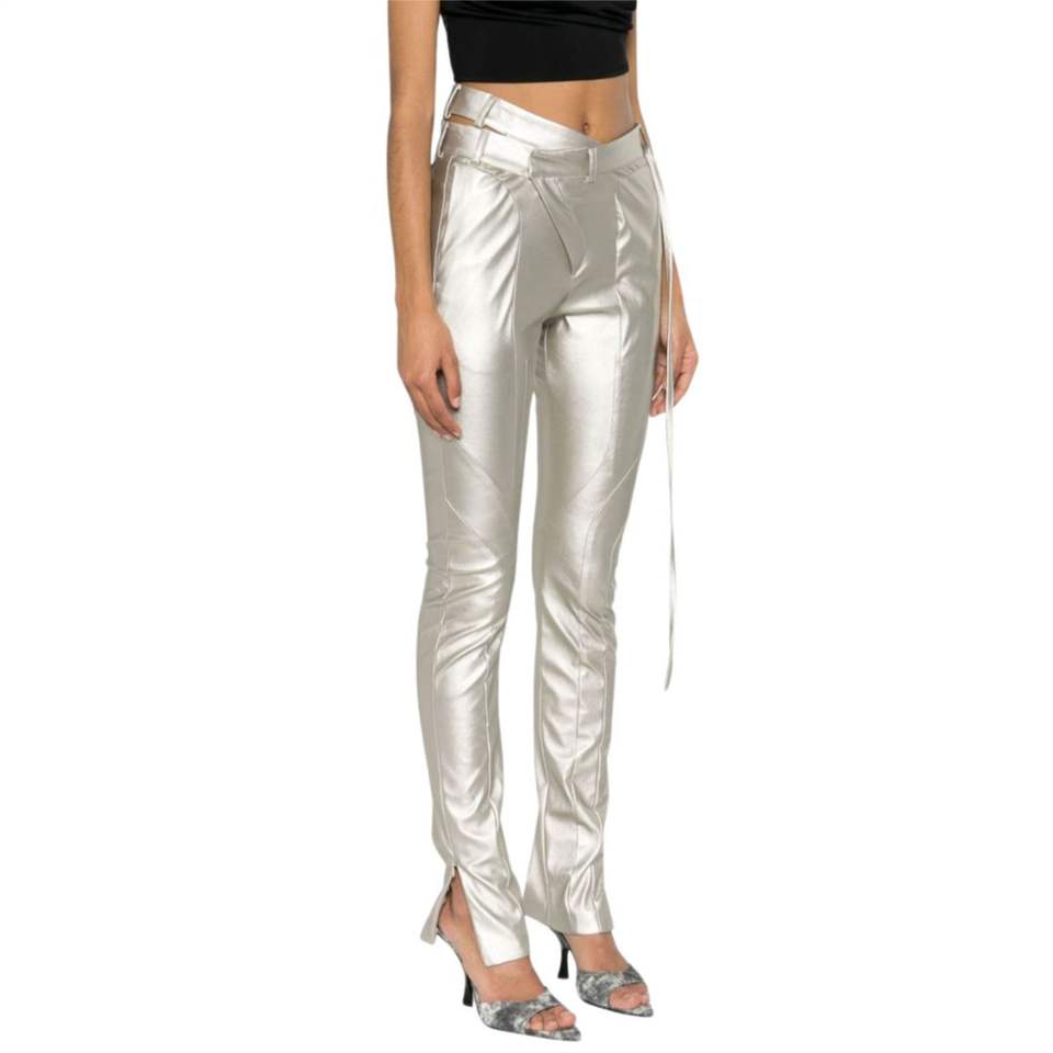 กางเกงเอวไม่สมมาตรเข็มขัดสีเงินดีไซน์แบบผอมตัดเป็นช่องมีห่วงรัดด้านหลังมีกระเป๋าแบบมีสไตล์