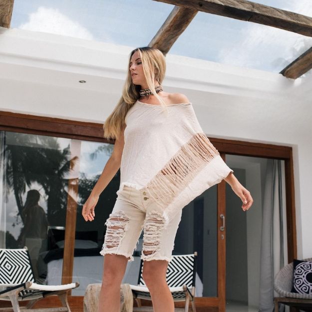 เสื้อโบโฮทรงอสมมาตรสำหรับผู้หญิง เสื้อคลุมโอเวอร์ไซส์ผ้าฝ้าย เสื้อทูนิคผ้าฝ้ายดิบ เสื้อผ้าออร์แกนิค เสื้อยืดสไตล์ฮิปปี้ เสื้อเบลาส์ขาดๆ สีเบจ