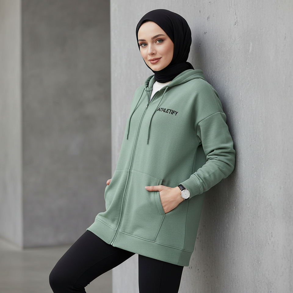 เสื้อฮู้ดแบบยาวมีซิปเต็มตัวสำหรับผู้หญิงมุสลิม แบรนด์ Athletify ผ้าเฟรนช์เทอร์รี่ ทรงหลวม สวมใส่สบาย เหมาะสำหรับออกกำลังกาย มีกระเป๋า