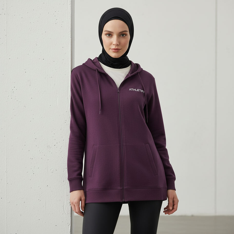 เสื้อแจ็คเก็ตฮู้ดแบบยาวทรงสปอร์ต Athletify ไซส์ใหญ่ ระบายอากาศได้ดี เหมาะสำหรับผู้หญิงมุสลิม สวมใส่สบาย ทรงหลวม เสื้อคลุมอิสลาม