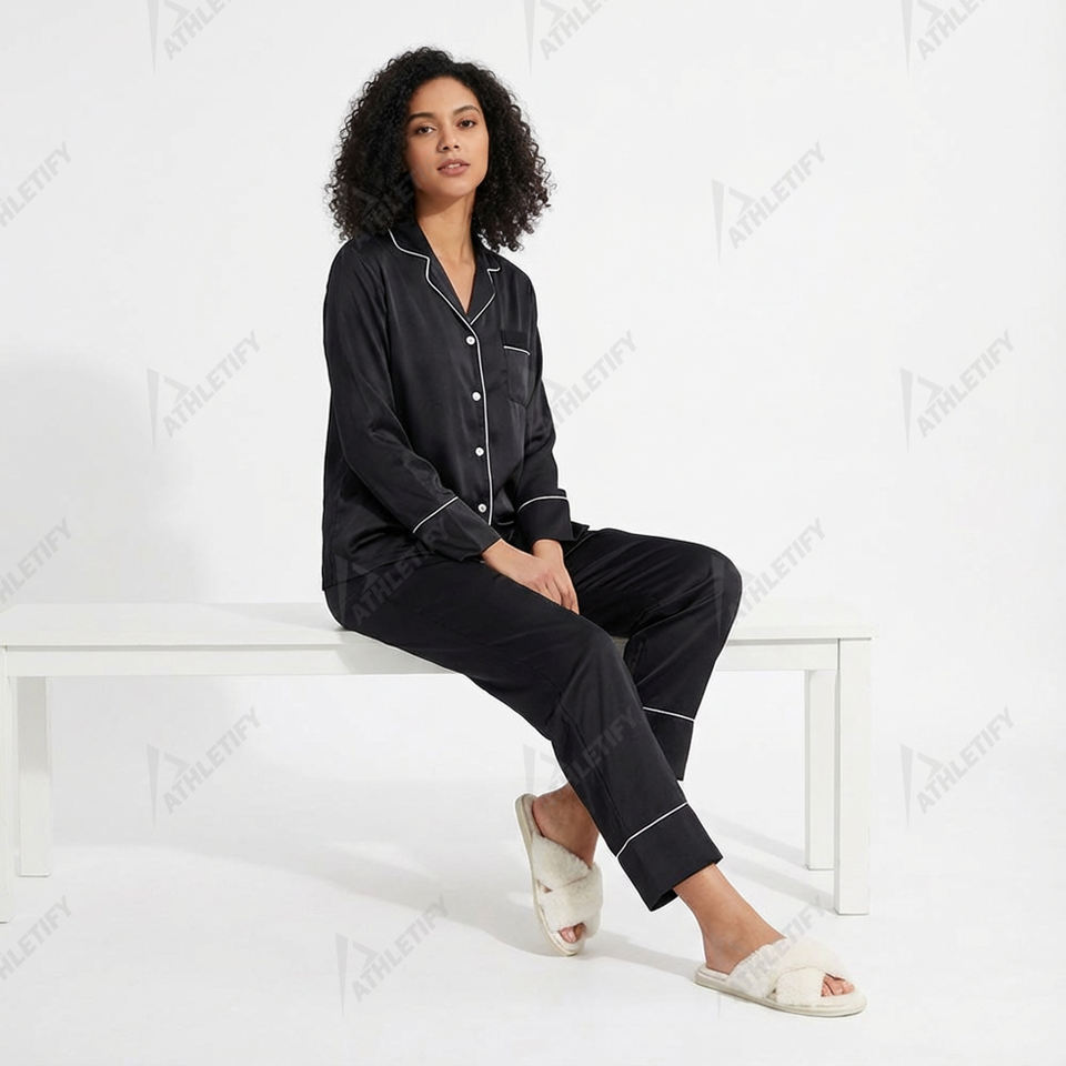 ชุดนอนเซ็กซี่ผ้าซาตินสำหรับผู้หญิง คอวี เอวยางยืด ทรงหลวม ผลิตจากโพลีเอสเตอร์ 100% มีหลายสีให้เลือก เหมาะสำหรับใส่นอนในฤดูร้อน