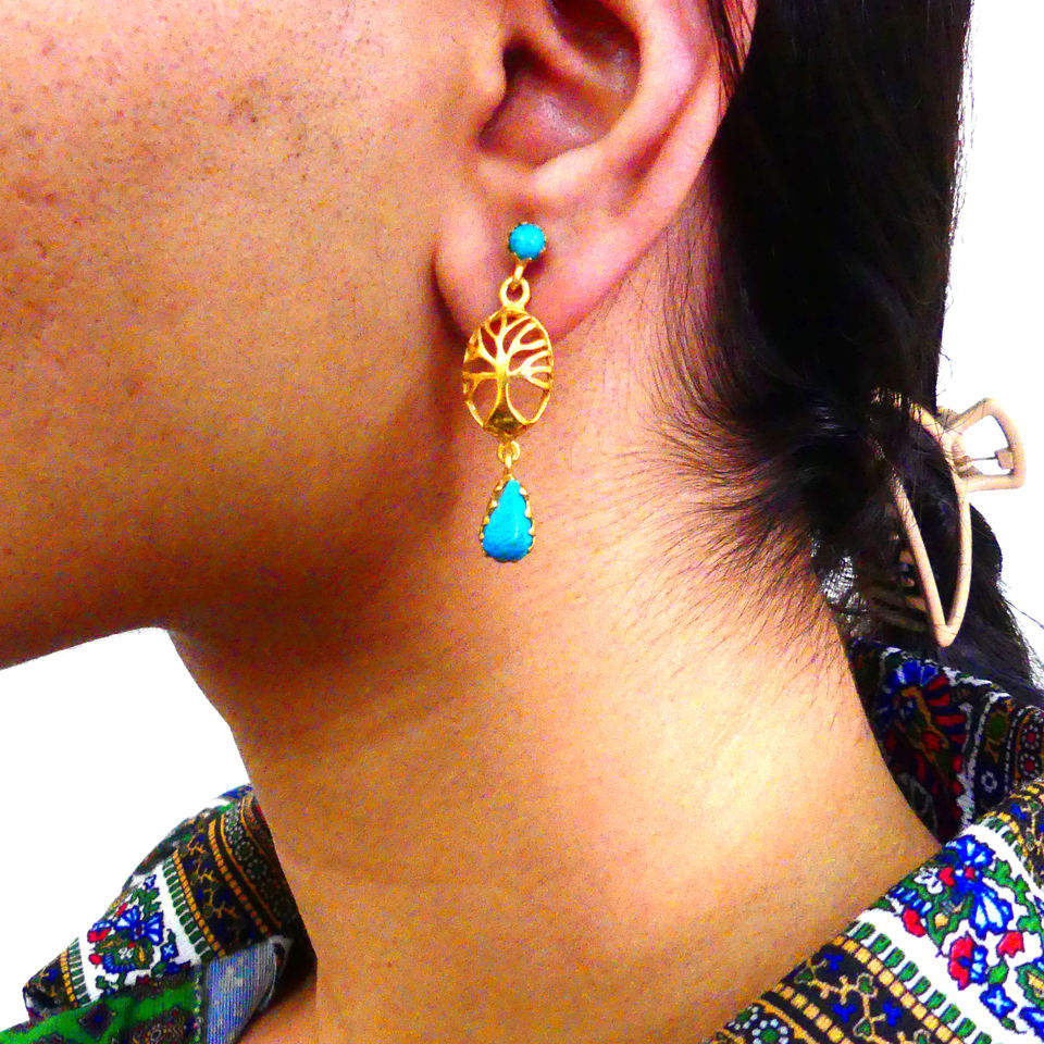 ต่างหูห้อยทรงหยดน้ำประดับพลอยเทอร์ควอยซ์ชุบทองเงินแท้ 925 ดีไซน์สวยหรูทันสมัย