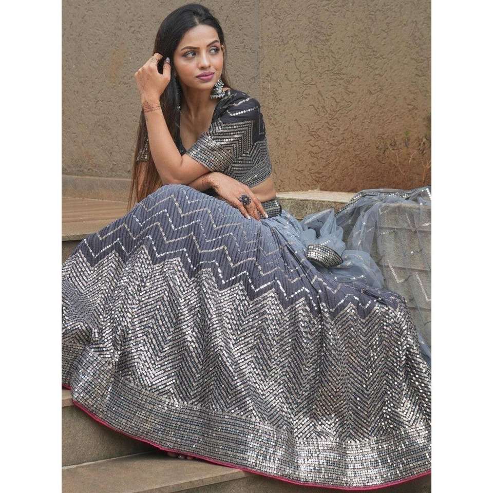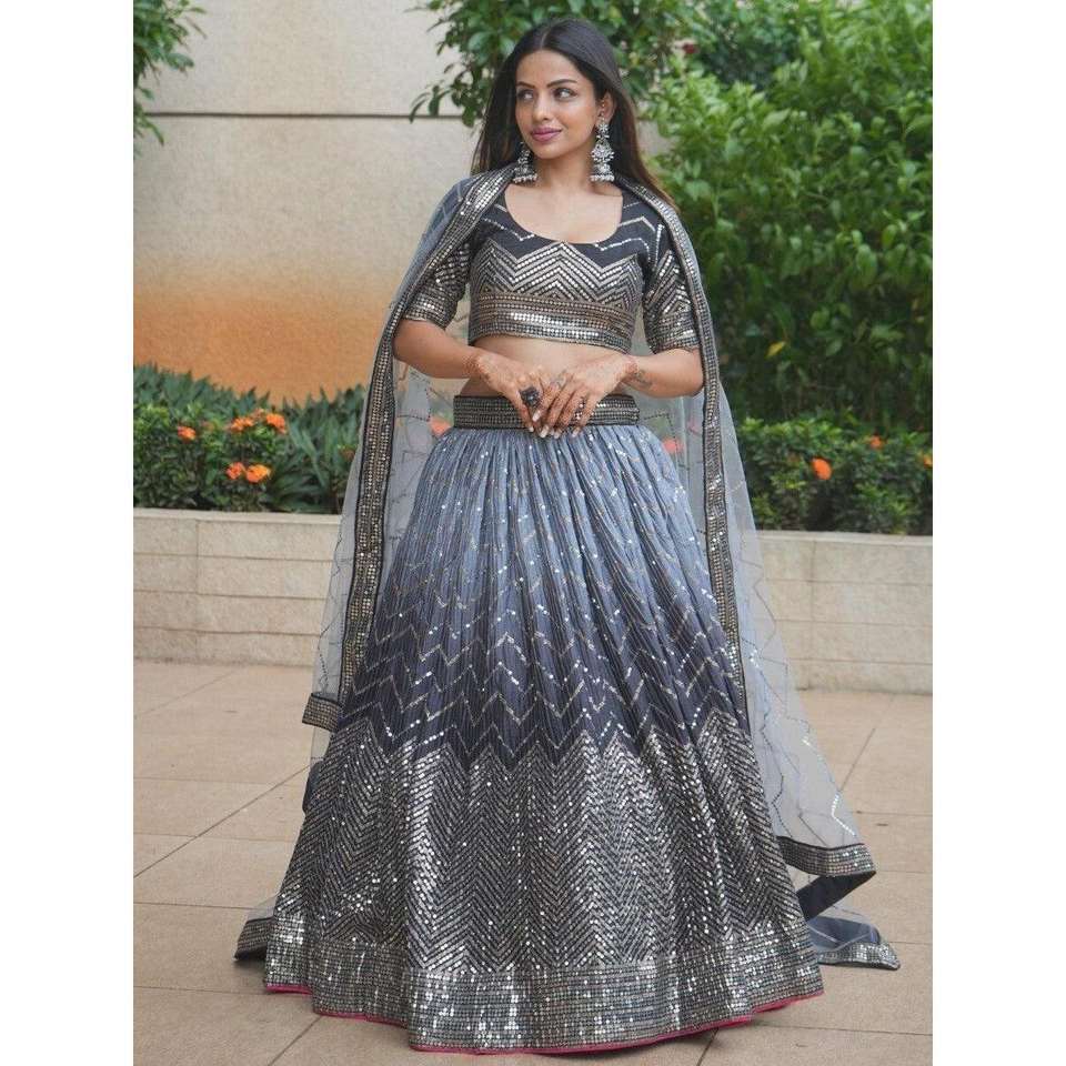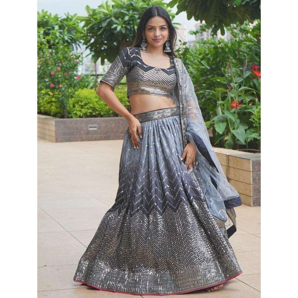 ชุดเลเฮนกาโชลีผ้าไหมปักเลื่อมสีดำสวยงาม ดีไซน์เนอร์ออกแบบ พร้อมผ้าคลุมไหล่ ผลิตโดย Zeel Clothing