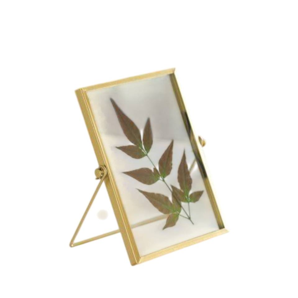 กรอบรูปงานศิลปะทรงสี่เหลี่ยมผืนผ้าทำจากทองเหลืองและกระจก ดีไซน์สวยงาม เหมาะสำหรับใส่ดอกไม้แห้งและรูปภาพ ตกแต่งบนโต๊ะ