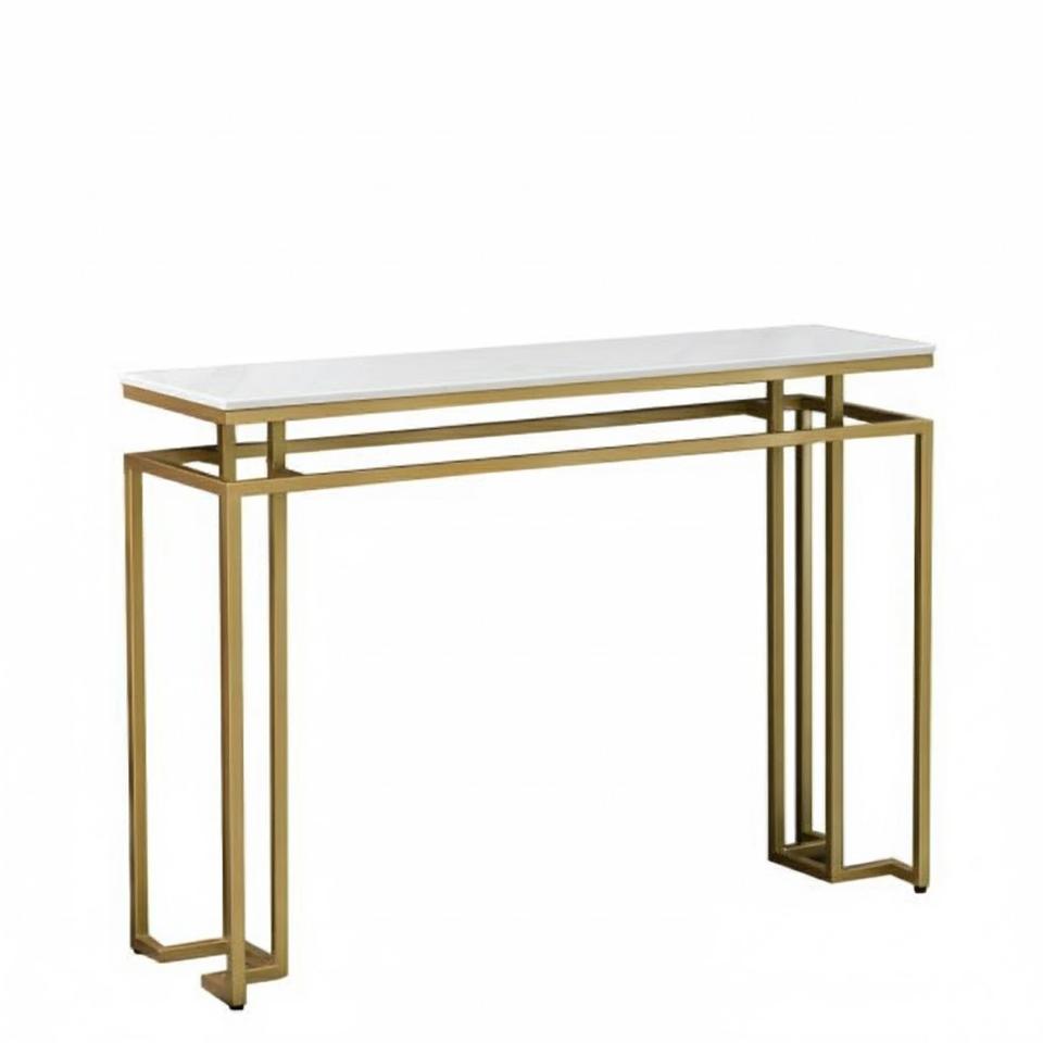 โต๊ะคอนโซลดีไซน์สวยงาม ผลิตจากหินเผาคุณภาพสูง พร้อมท็อปหินอ่อนสีขาวทนทาน และโครงโลหะสีทอง เหมาะสำหรับโรงแรม ราคาดีที่สุด