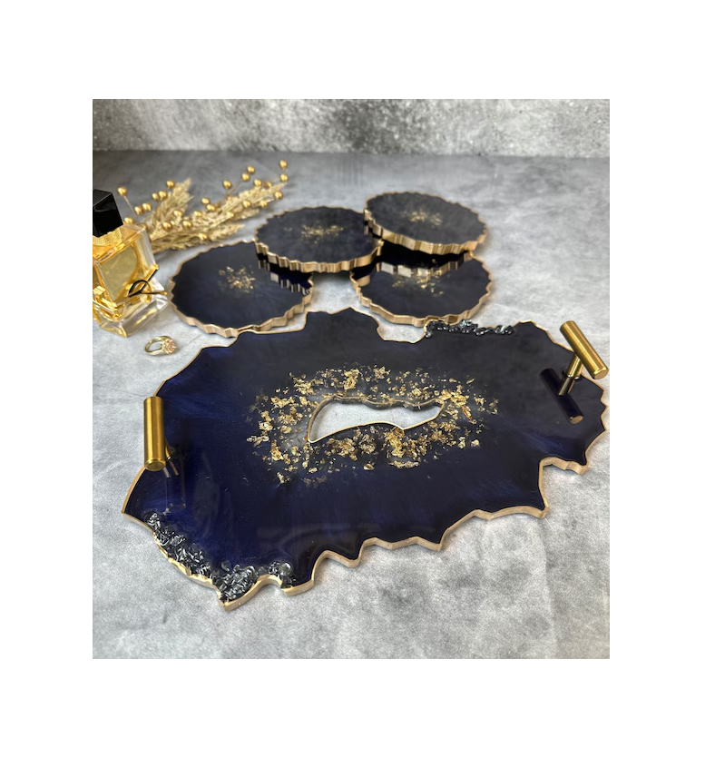 ชุดถาดรองเรซินอีพ็อกซี่สีเขียวแกมน้ำเงิน4ชิ้นถาดเสิร์ฟ