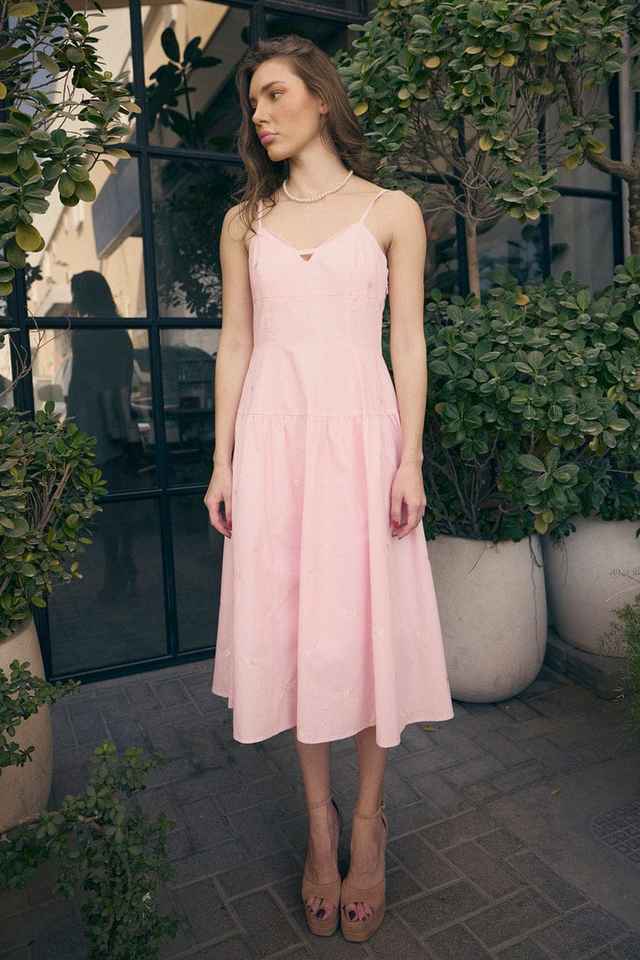 เดรสแม็กซี่ของผู้หญิงสไตล์โบฮีเมียนลำลองความยาวปานกลางผ้าคอตตอนชุดเดรสสีชมพูธรรมชาติสำหรับ100%