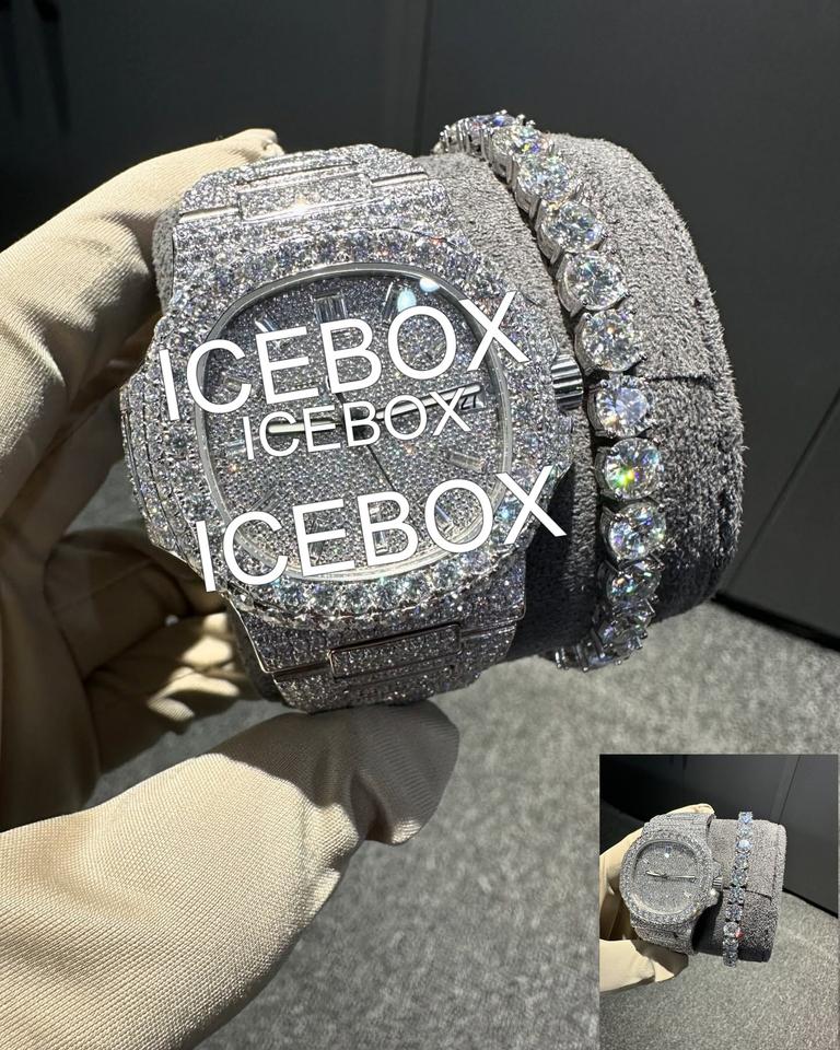 นาฬิกาข้อมือผู้ชายสุดเท่ ตัวเรือนสแตนเลสสตีล กันน้ำ 10 บาร์ หน้าปัดกระจก ประดับเพชรโมอิสซาไนต์เต็มหน้าปัด สายแบบกำไลข้อมือ