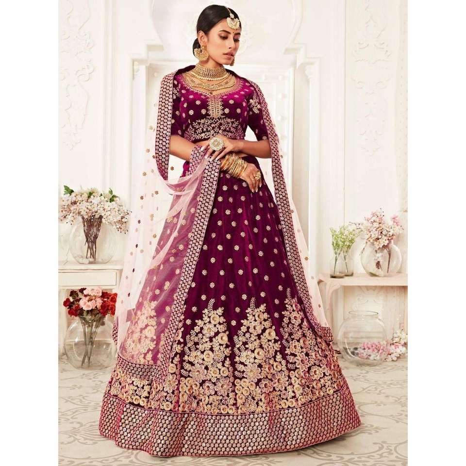 ชุดเจ้าสาวผ้ากำมะหยี่ปักสีม่วงดึงดูดใจ lehenga choli
