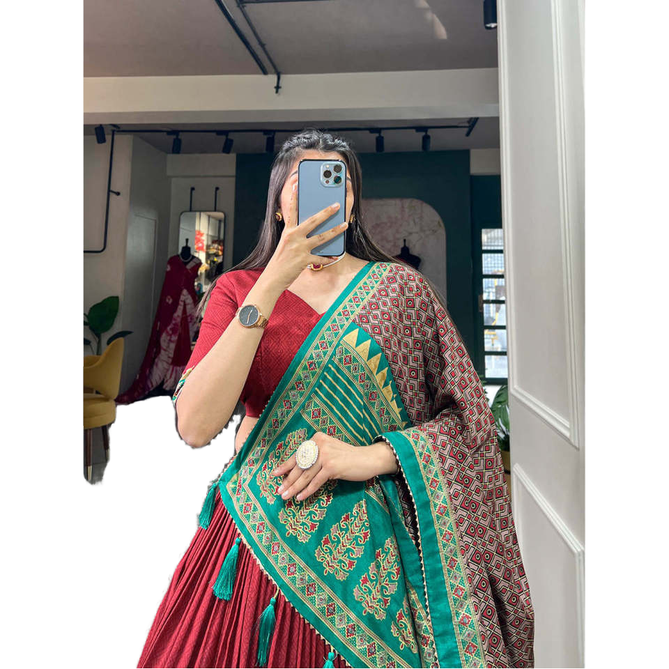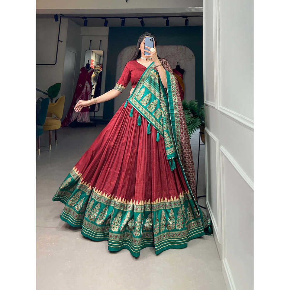 ผ้าไหมทัสซาร์สีแดงสวยและพิมพ์ลาย lehenga choli เสื้อผ้ายุโรป
