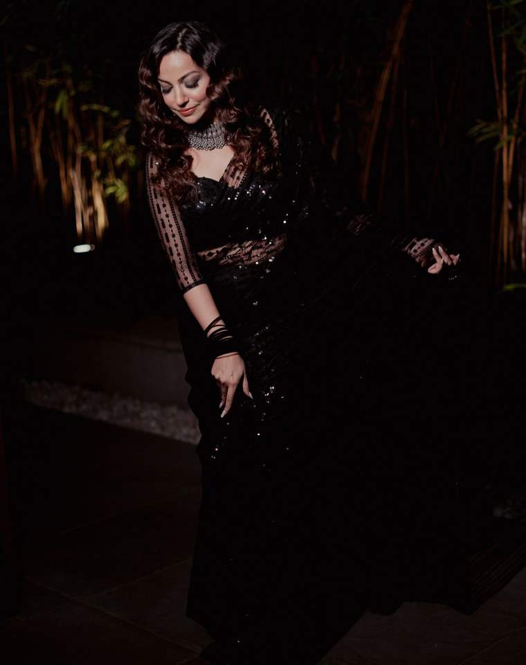 ชุดส่าหรีงานแต่งงานสไตล์บอลลีวูดสีดำสุดเซ็กซี่ คุณภาพเยี่ยม ตกแต่งด้วยผ้าตาข่ายปักเลื่อม ราคาถูก