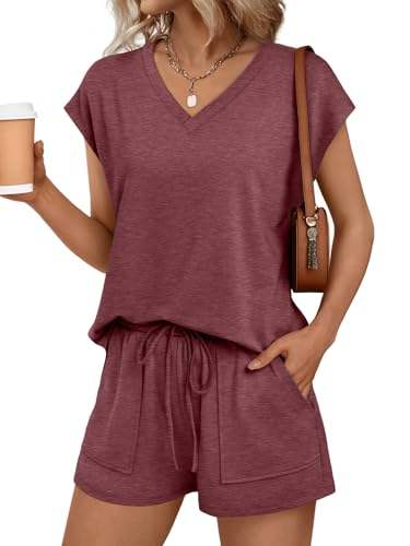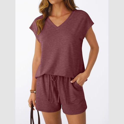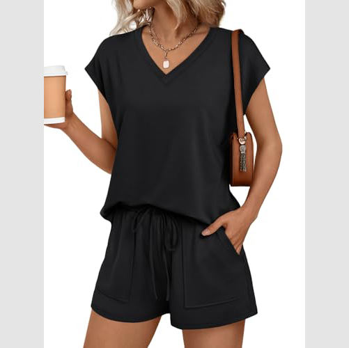 เสื้อคอวีทรงสวยเก๋ สีสันสดใส ดีไซน์ขอบเอวเก๋ๆ ชุดเซ็ตฤดูร้อนสำหรับผู้หญิง ชุดสองชิ้น กางเกงขาสั้น ชุดเซ็ตผู้หญิง