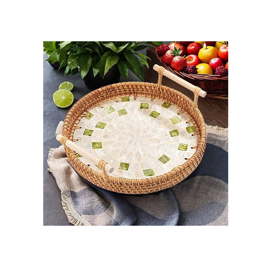 ถาดเสิร์ฟลายมุกและหวายพร้อมหูจับ ดีไซน์สวยงาม เหมาะสำหรับงานแต่งงาน โต๊ะอาหาร ถาดเสิร์ฟและเก็บอาหาร