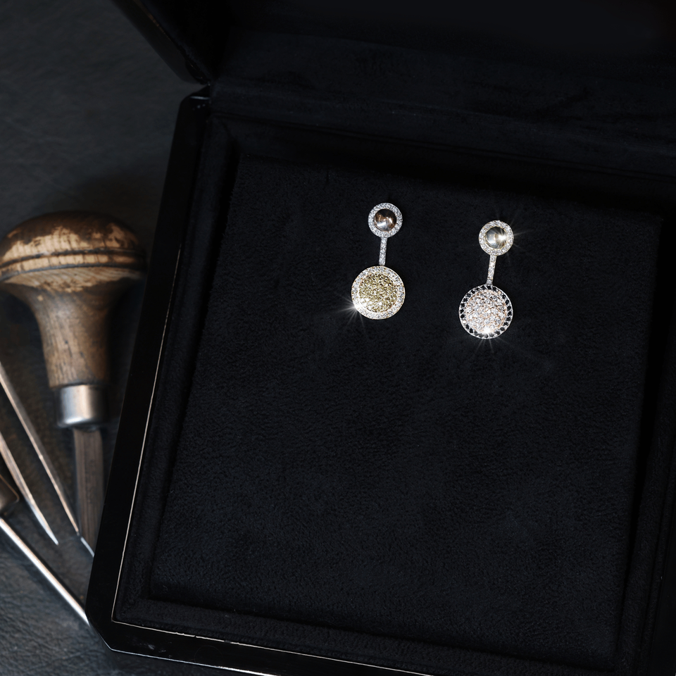 ชุดต่างหู Aurelia Pavé ประดับเพชรขาว เหลือง และดำ คุณภาพ D/E-VVS-VS เพาะเลี้ยงในห้องปฏิบัติการ ดีไซน์ไม่สมมาตร ตัวเรือนทองคำแท้ 18k แบบห้อย
