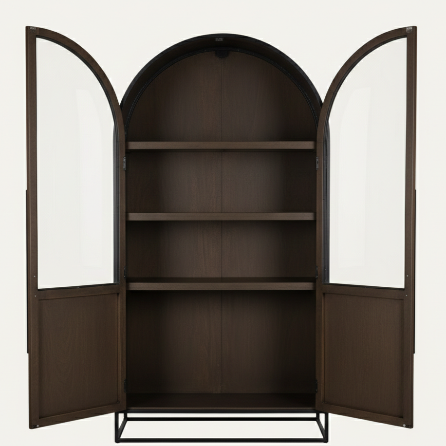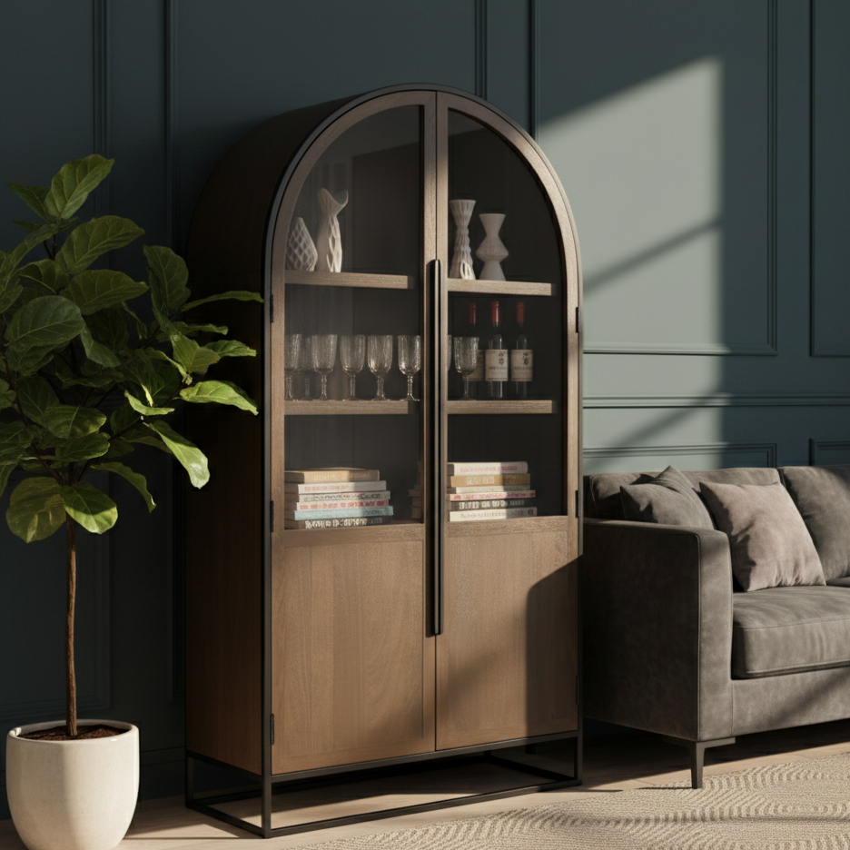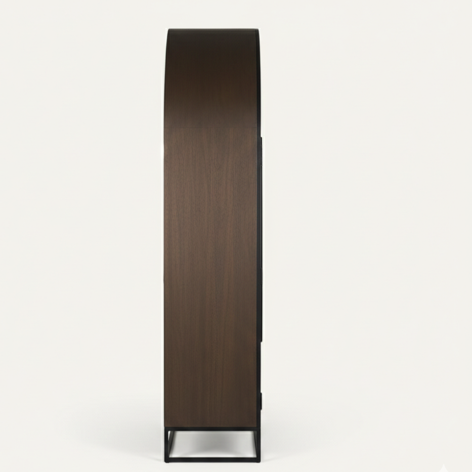 ตู้เก็บของทรงโค้งทันสมัยทำจากไม้เนื้อแข็งคุณภาพสูง Aurelius เป็นมิตรกับสิ่งแวดล้อม ประหยัดพื้นที่ เหมาะสำหรับห้องนั่งเล่น บาร์ในบ้าน ห้องเก็บไวน์ โรงแรม