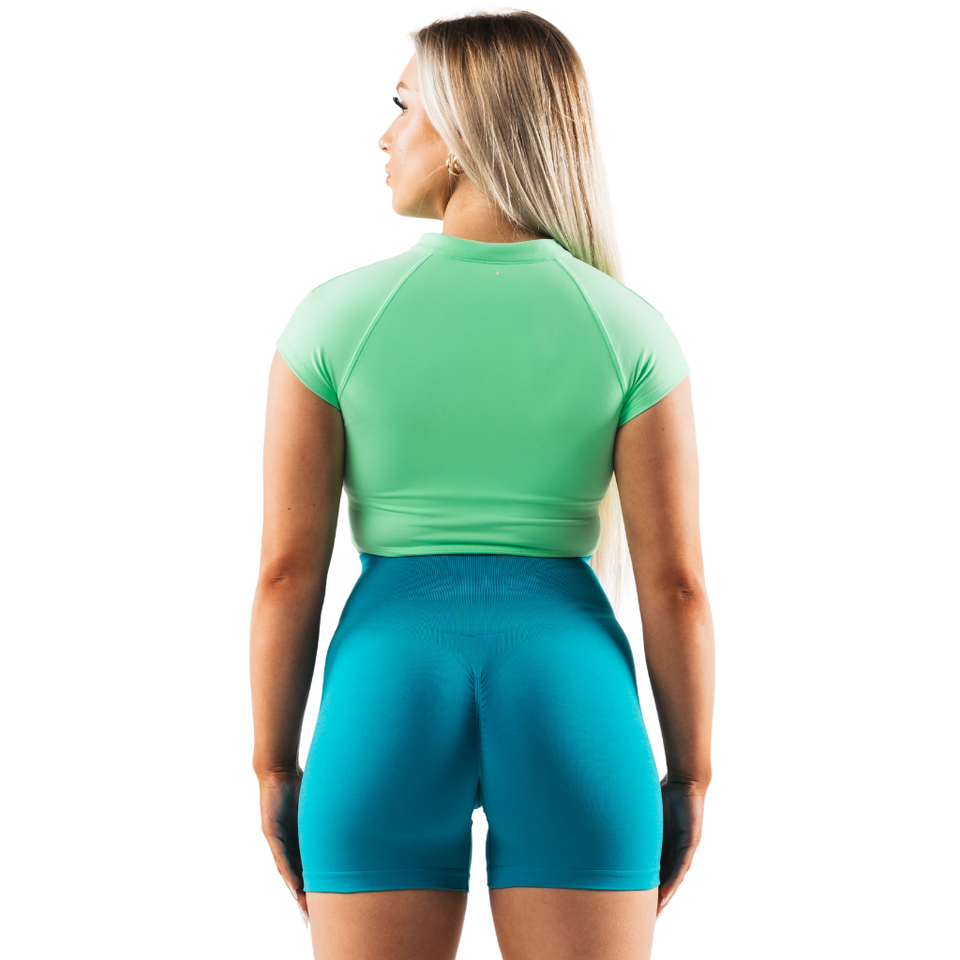 เสื้อชั้นในกีฬา Aurora Green แขนสั้น ซิปหน้า ไร้ตะเข็บ ยืดหยุ่นได้ เหมาะสำหรับโยคะ ฟิตเนส ออกกำลังกาย เสื้อครอปท็อป