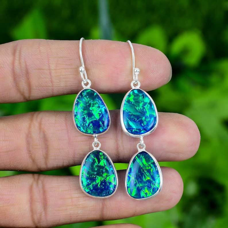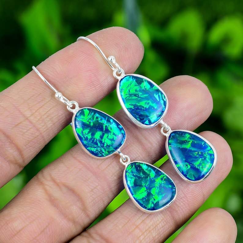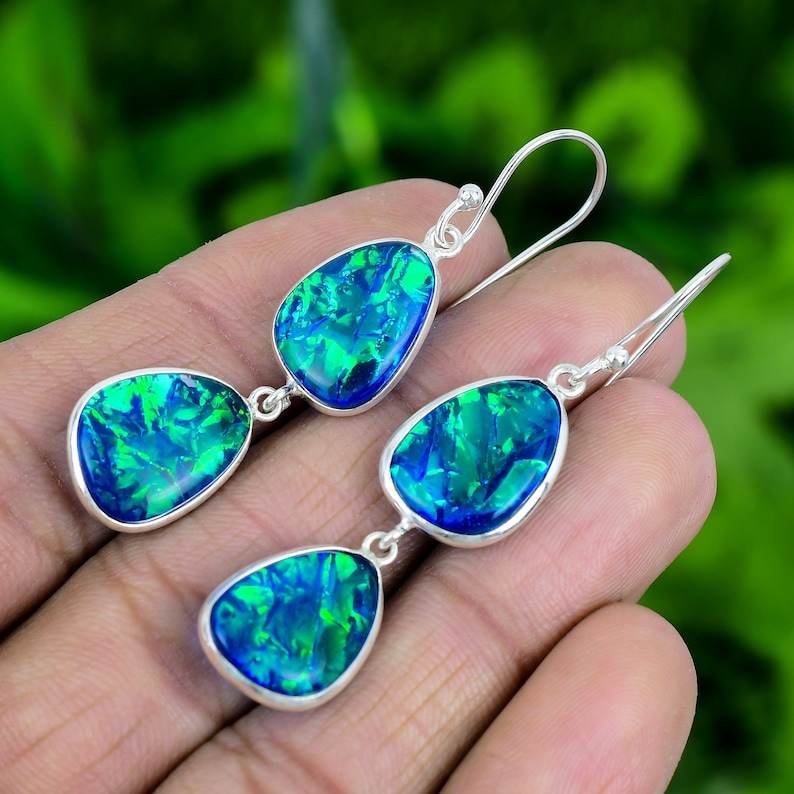 ต่างหูเงินแท้ชุบทองประดับโอปอลไฟร์ออสเตรเลียทรงสามเหลี่ยม งานแฮนด์เมด เครื่องประดับอัญมณี ของขวัญสำหรับผู้หญิง ดีไซน์หรูหรา