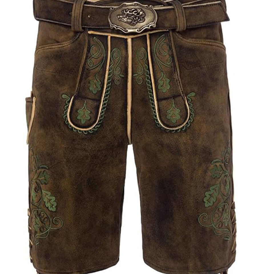 Authentic German Men's Lederhosen Genuine Leather Oktoberfest Outfit with Embroidery Dark Brown Short Pants