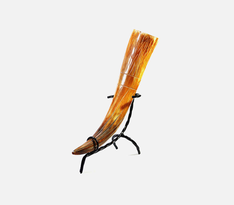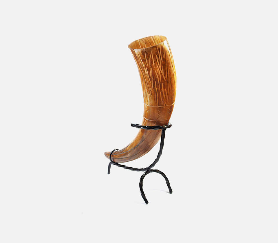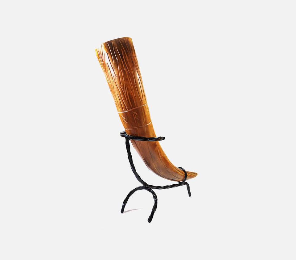 Authentic Handcrafted Honey Toned Viking Drinking Horn With Hand Carved Norse Runes And Sturdy Wrought Iron Tripod Stand