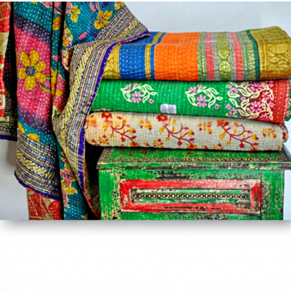 ผ้าห่มทอมืออินเดียแท้ วินเทจ ทำจากผ้าส่าหรี 100% ผ้าฝ้าย ปะต่อแบบคันธา ใช้ได้สองด้าน ลายชนเผ่า ขนาดเตียงคู่ เหมาะสำหรับใช้ในบ้านและโรงแรม