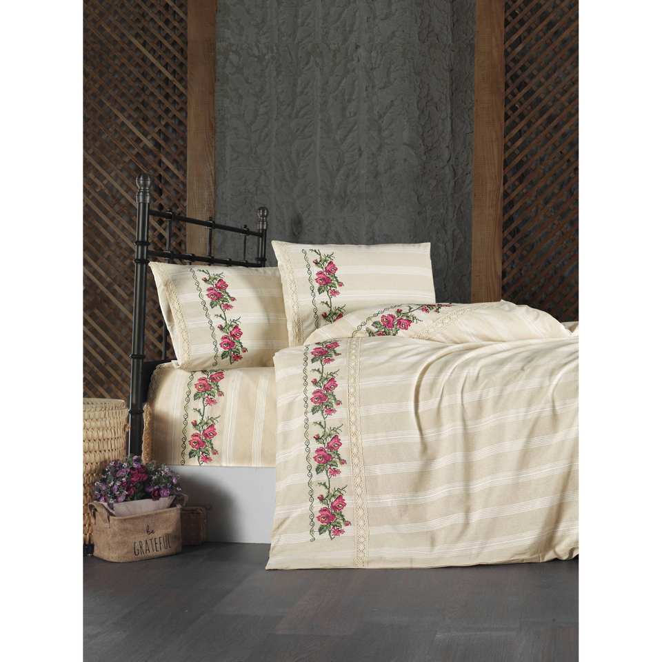 ชุดผ้าปูที่นอนคิงไซส์แท้ ลายทางสีครีม ปักลายดอกไม้สีชมพู 4 ชิ้น สำหรับใช้ในบ้าน ทำจากผ้าฝ้าย
