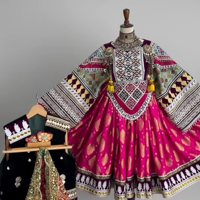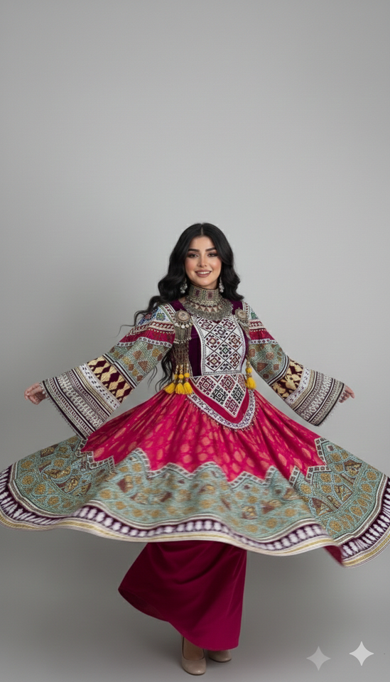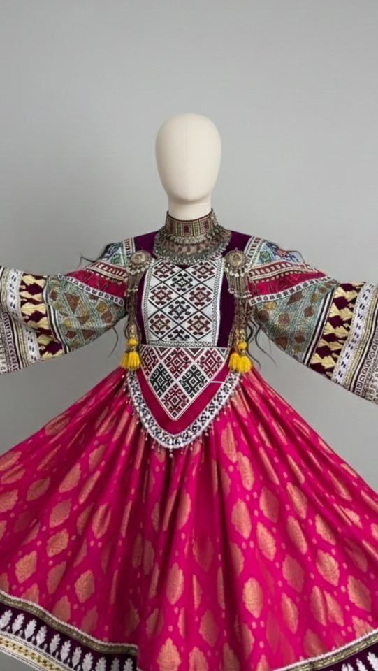 ชุดชนเผ่ากุจิอัฟกันสีชมพูม่วงแท้ พร้อมงานปักมือลายเรขาคณิตอย่างประณีตบนแขนทรงกระดิ่งกว้าง