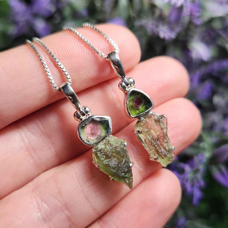 จี้และสร้อยคอโมลดาไวต์แท้ พร้อมทัวร์มาลีนสีแตงโม เครื่องประดับที่ไม่เหมือนใครเพื่อการเติบโตทางจิตวิญญาณ