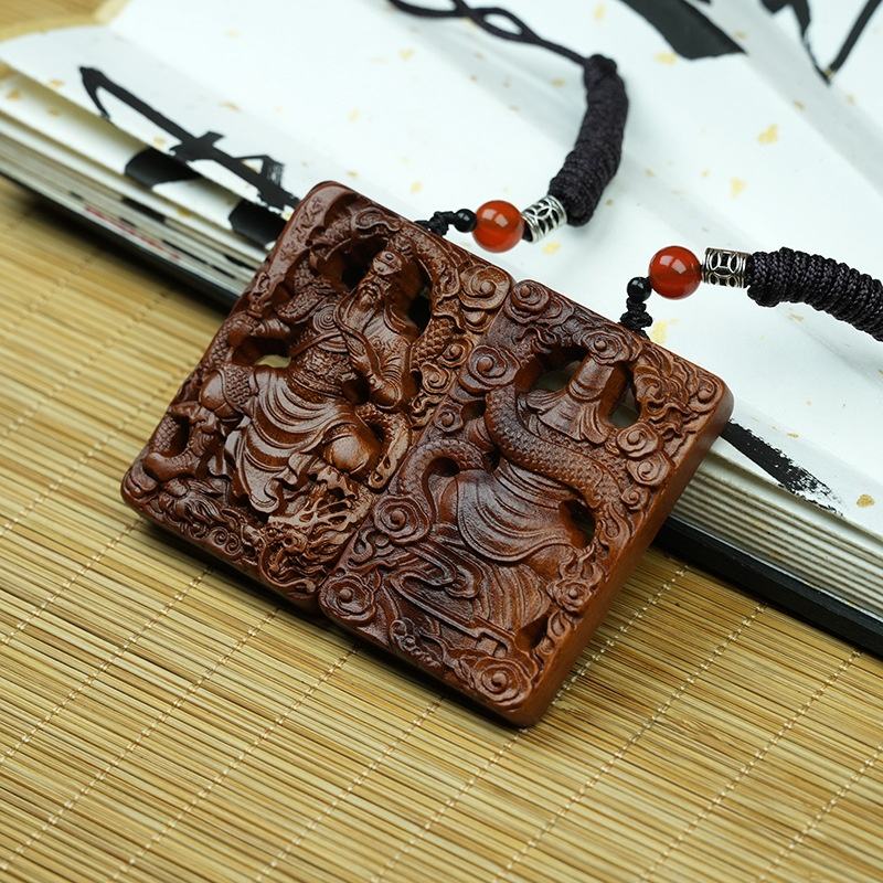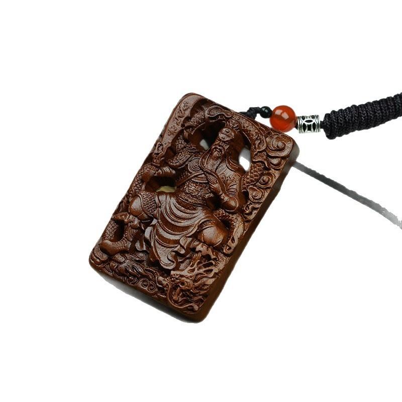 จี้ไม้กวนอูทรงสี่เหลี่ยม ทำจากไม้ธรรมชาติแท้ ด้วยเทคนิคการตีด้วยฟ้า งานฝีมือสุดพิเศษ ผลิตในประเทศจีน สำหรับเครื่องประดับส่วนตัว