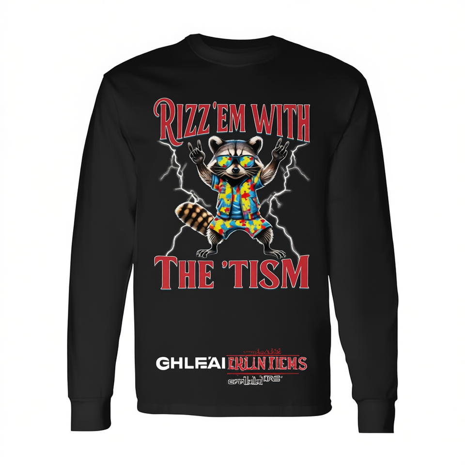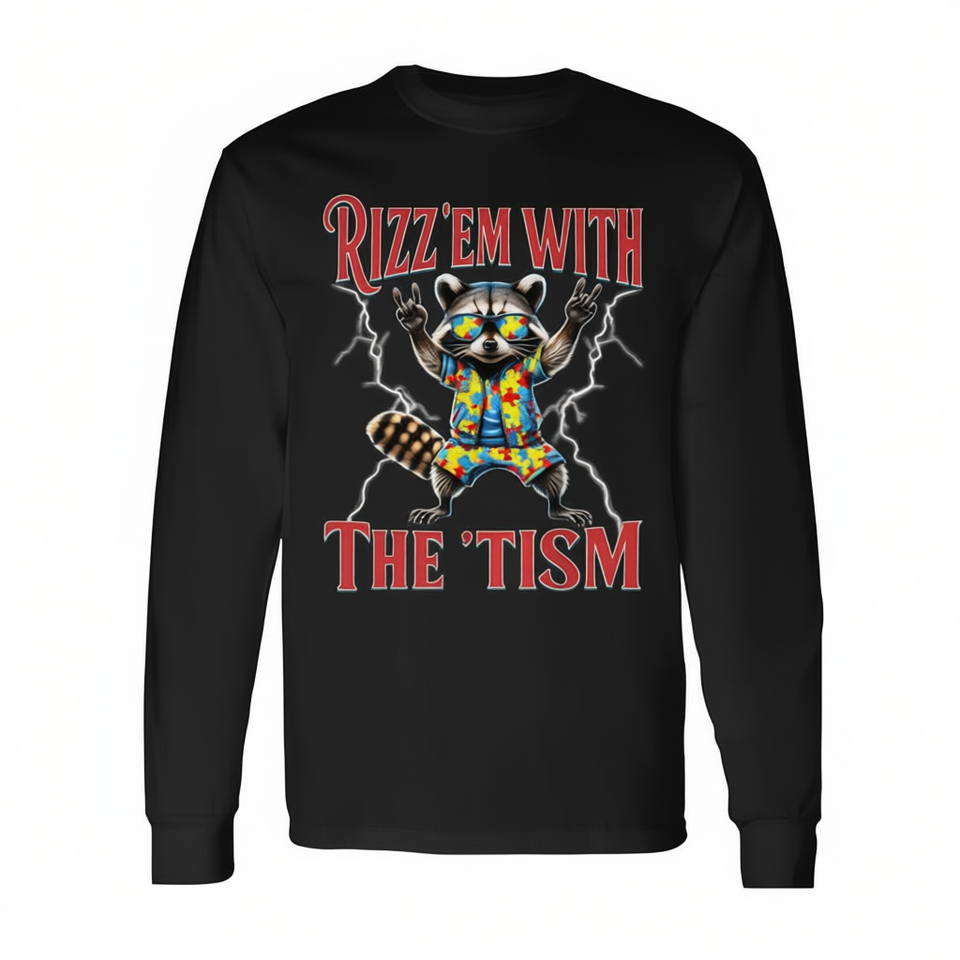 เสื้อยืดแขนยาวเพื่อสร้างความตระหนักเกี่ยวกับออทิสติก เสื้อฮู้ดโปรโมชั่น เสื้อสเวตเชิ้ต แรคคูนออทิสติก แฮนด์ร็อค มีม 'ออทิสติก ริซ แอม ทิสม์'