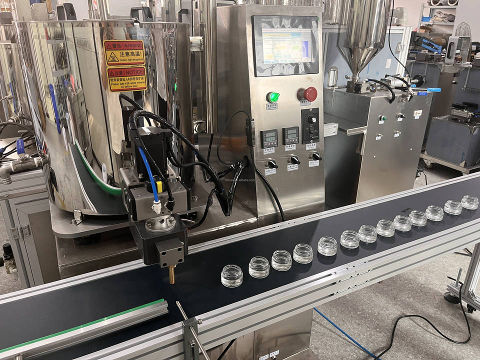 เครื่องบรรจุครีมอัตโนมัติพร้อมระบบทำความร้อนและผสม สำหรับเครื่องสำอาง ลิปสติก ลิปบาล์ม ลิปกลอส แว็กซ์จัดแต่งทรงผม บรรจุขวดและกระป๋อง