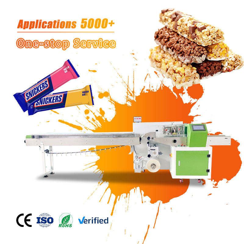 เครื่องห่อแบบไหลแนวนอนอัตโนมัติสำหรับเค้กชิ้น ซีเรียล กราโนล่า โปรตีนบาร์ บรรจุภัณฑ์แบบพิลโลว์แพ็คความเร็วสูงพร้อมระบบปิดผนึก