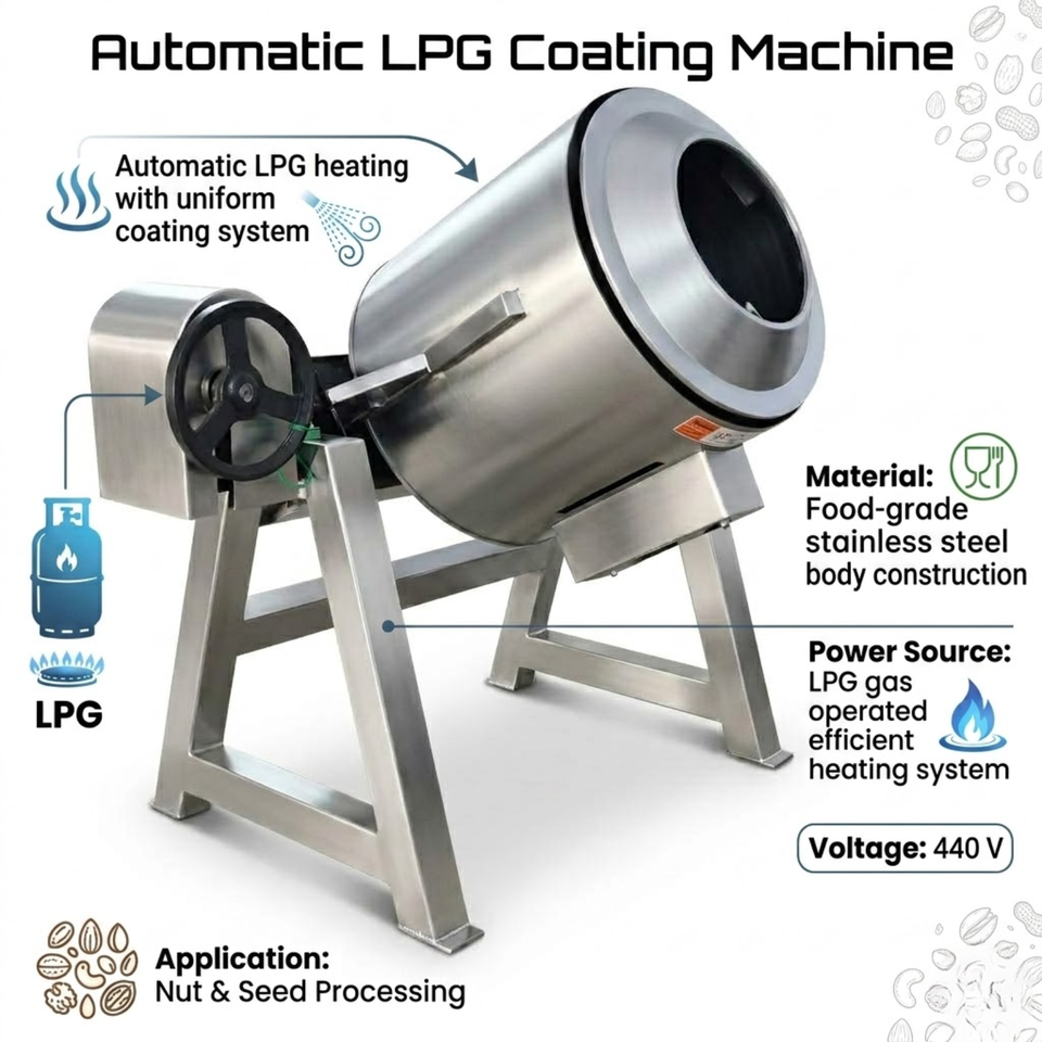 เครื่องเคลือบ LPG อัตโนมัติสำหรับการคั่วเมล็ดกาแฟและถั่ว | ไมครอน อินเดีย | สแตนเลสเกรดอาหาร | 440V | กระดาษ/ฟอยล์พลาสติก