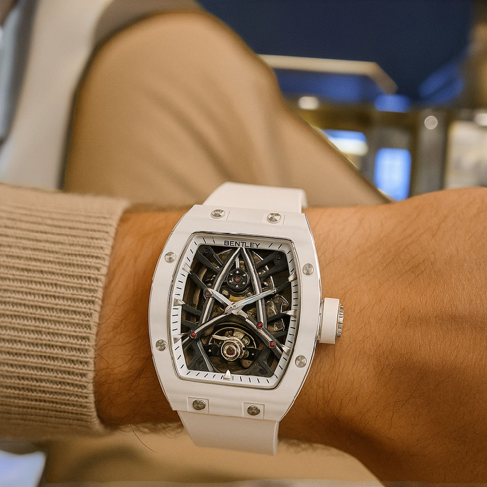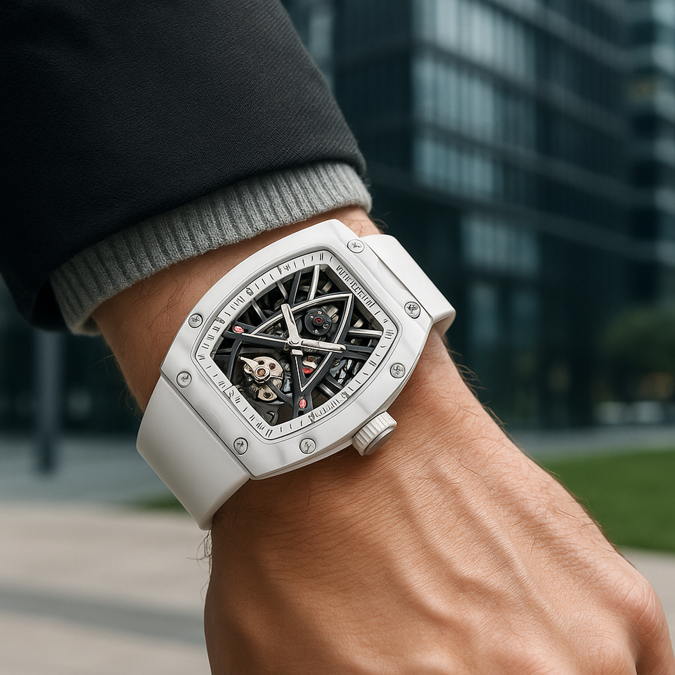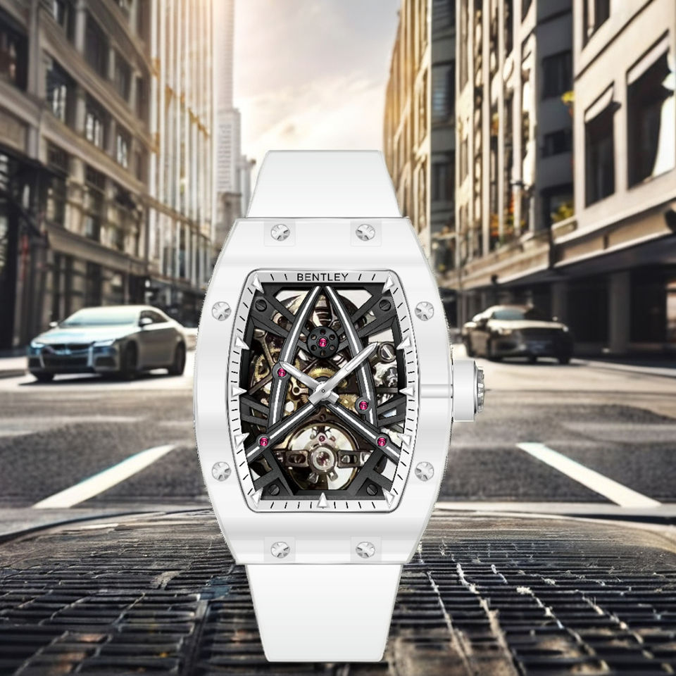นาฬิกากลไกอัตโนมัติดีไซน์แบบโครงกระดูกคู่หน้าปัดคริสตัลอะนาล็อกแสดงคาร์บอนไฟเบอร์