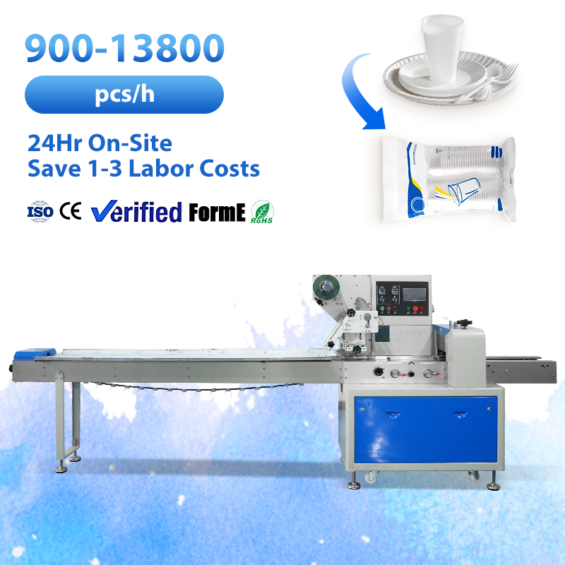 เครื่องบรรจุภัณฑ์แบบอัตโนมัติอเนกประสงค์สำหรับห่อฟิล์มแบบไหล สำหรับถ้วยกระดาษ ถ้วยพลาสติก แบบแพ็คทรงหมอน