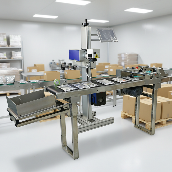 เครื่องมาร์กกิ้งด้วยเลเซอร์ยูวีแบบอัตโนมัติสำหรับถุงพลาสติก กล่องกระดาษ วันที่ รหัส QR รหัสเมทริกซ์ โซลูชันการมาร์กกิ้งแบบติดตามได้