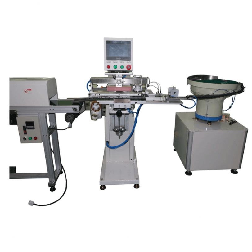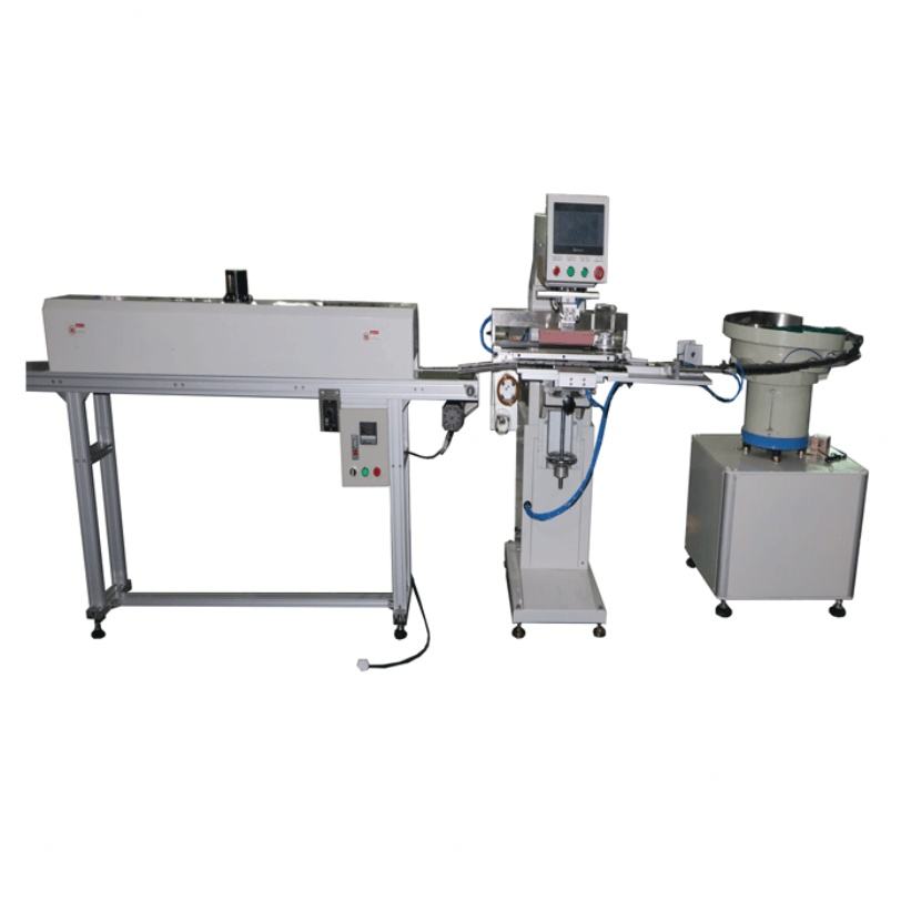 เครื่องพิมพ์แพดฝาพลาสติกอัตโนมัติแบบถ้วยหมึกสีเดียว พร้อมสายอบแห้งและอุปกรณ์ป้อนวัสดุสำหรับการพิมพ์สีเดียว