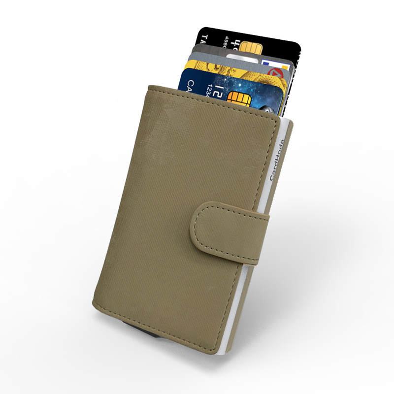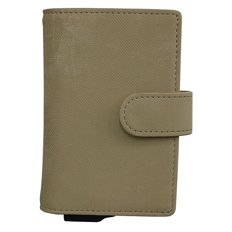 ที่ใส่บัตร RFID แบบป๊อปอัพอัตโนมัติที่ใส่นามบัตรที่ออกแบบโดยโรงงานกระเป๋าสตางค์อลูมิเนียม PU มีซิปผ้าลินินสั้นทันสมัย