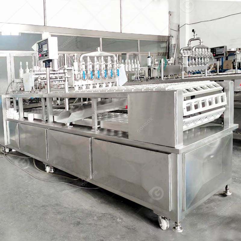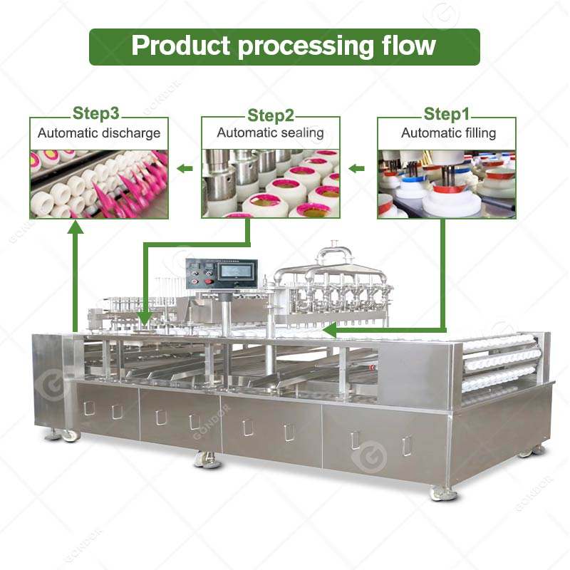 เครื่องบรรจุและปิดผนึกแบบหมุนอัตโนมัติสำหรับซุปเหลว ฮัมมัส เจลาโต้ แบบ 4 หัวบรรจุ สำหรับบรรจุในถ้วย/ถาด