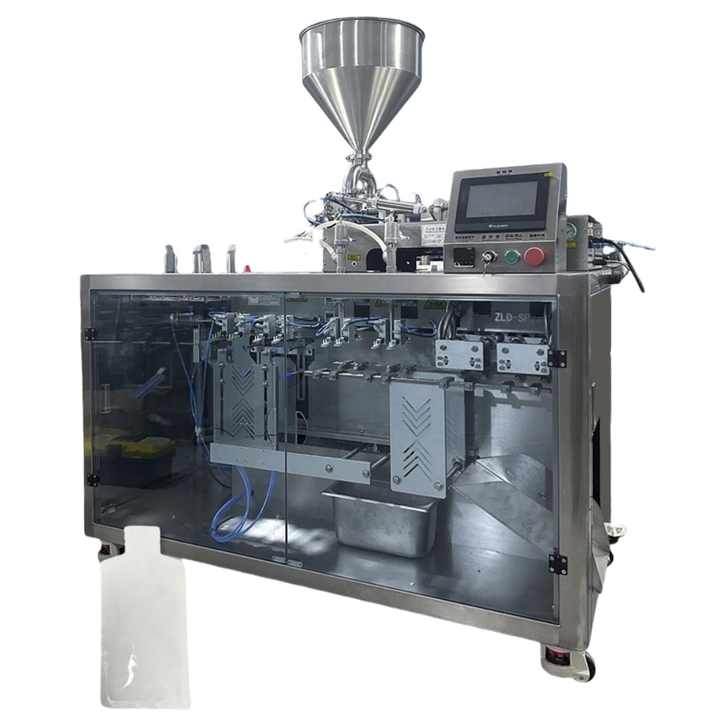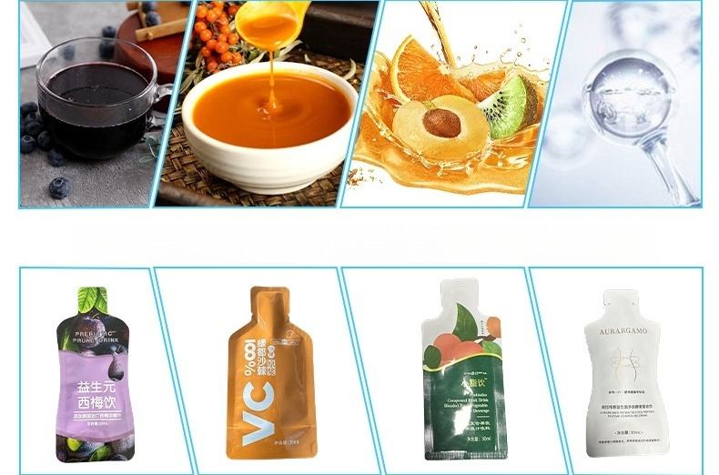 เครื่องบรรจุและปิดผนึกซองสำเร็จรูปทรงพิเศษอัตโนมัติสำหรับน้ำผลไม้ น้ำมันทำความสะอาด ของเหลวข้นหนืด ซอสมะเขือเทศ