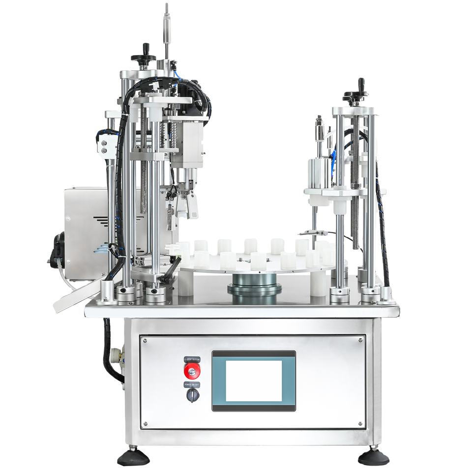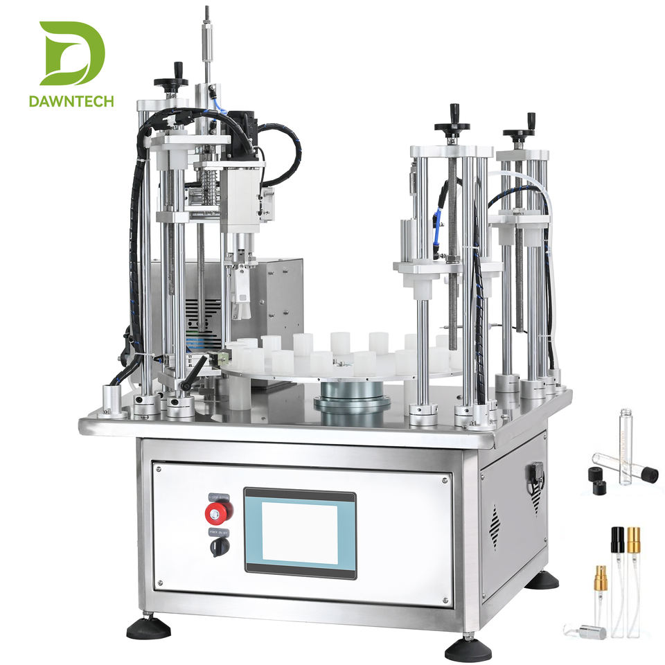 เครื่องจักรอัตโนมัติแบบตั้งโต๊ะพร้อมระบบหมุนในตัวสำหรับบรรจุ ปิดผนึก และฝาขวดแก้วขนาดเล็กสำหรับบรรจุน้ำมันหอมระเหย