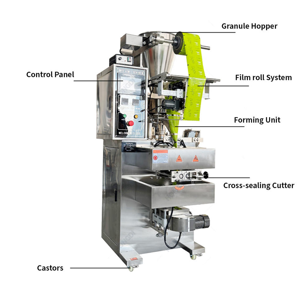 เครื่องบรรจุเม็ดแบบม้วนฟิล์มแนวตั้งอัตโนมัติ พร้อมอุปกรณ์จ่ายแบบถ้วยหมุน ขับเคลื่อนด้วยมอเตอร์ สำหรับบรรจุน้ำตาล เกลือ ข้าว เมล็ดพืช