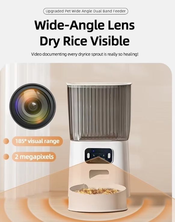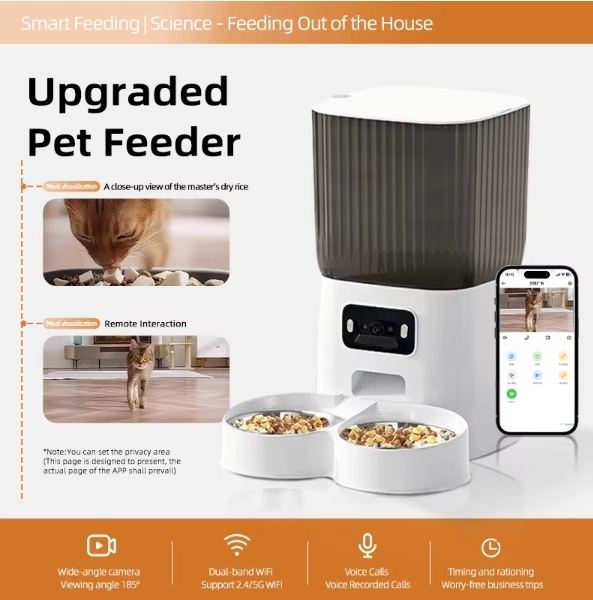 เครื่องให้อาหารสัตว์เลี้ยงอัตโนมัติ 5.5 ลิตร ทำจากพลาสติกทนทาน พร้อมกล้อง HD ในตัว ใช้พลังงานได้สองระบบ ทำความสะอาดง่าย สำหรับสุนัขพันธุ์เล็กทุกวัย