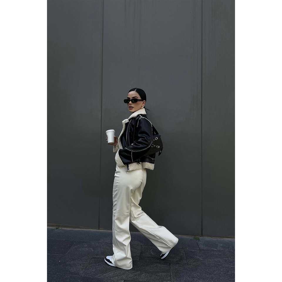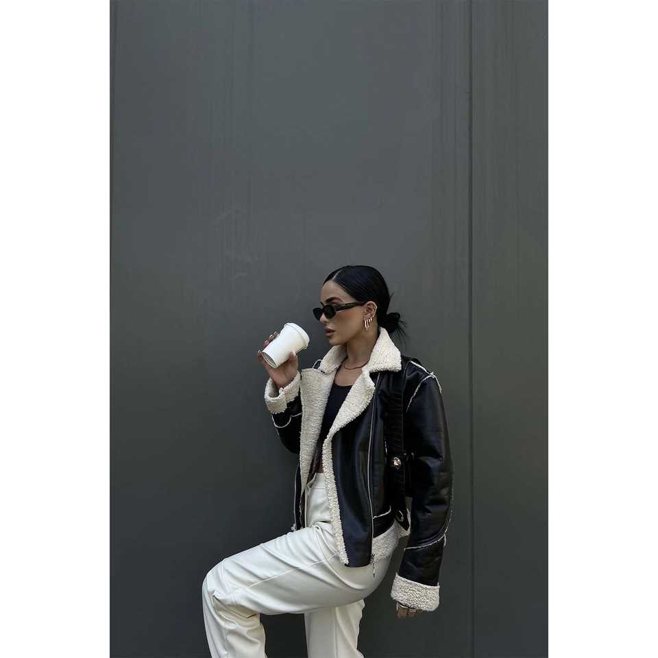 แจ็คเก็ตหนังแกะสีดำสำหรับฤดูใบไม้ร่วง แต่งขนเฟอร์แบบริ้ว ซับในผ้าซาตินผสมสแปนเด็กซ์ รับสกรีนโลโก้ ไซส์ผู้หญิง
