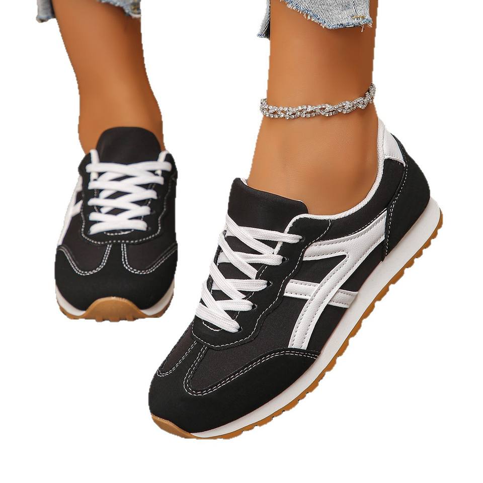 รองเท้ากีฬาลำลองสไตล์เรโทรสีดำขาวแบบบล็อกสี ดีไซน์เชือกผูก ระบายอากาศได้ดี เหมาะสำหรับใส่เดินทางในชีวิตประจำวัน
