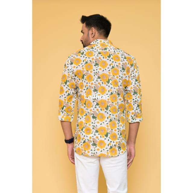 เสื้อชายหาดลำลองสไตล์โบฮีเมียนของผู้ชายเสื้อคอตตอนทำมือลายดอกไม้สีเหลืองระบายได้มีกระดุมปิด